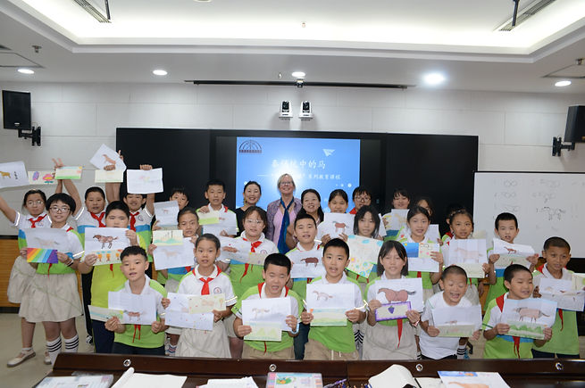 After workshops on how to draw a horse in 10 steps, involving over 100 children, decorated letters and envelopes were taken by Miranda Creswell to and from China and the UK.